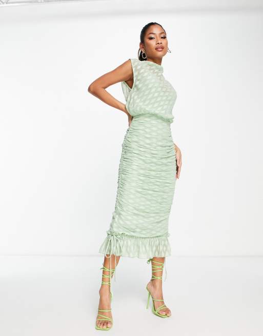 Asos Design Hochgeschlossenes Midikleid In Grun Mit Strukturmuster Und Raffung Asos